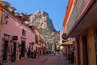 The town of Bernal appears as a colourful oasis in an otherwise neutral palette of high desert.